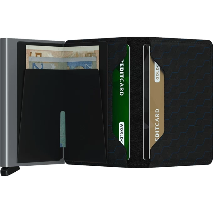 Dankzij het ruimer gesneden leer is er plaats voor meer kaarten, briefgeld, visitekaartjes en bonnetjes. De basis van de Slimwallet is de Secrid Cardprotector en biedt ruimte aan zes kaarten. Dankzij het unieke ontwerp schuiven de kaarten trapsgewijs naar buiten voor een eenvoudige selectie. Belangrijkste passen zijn optimaal beschermd, zowel tegen buigen en breken als tegen ongewenst uitlezen van RFID-kaarten.